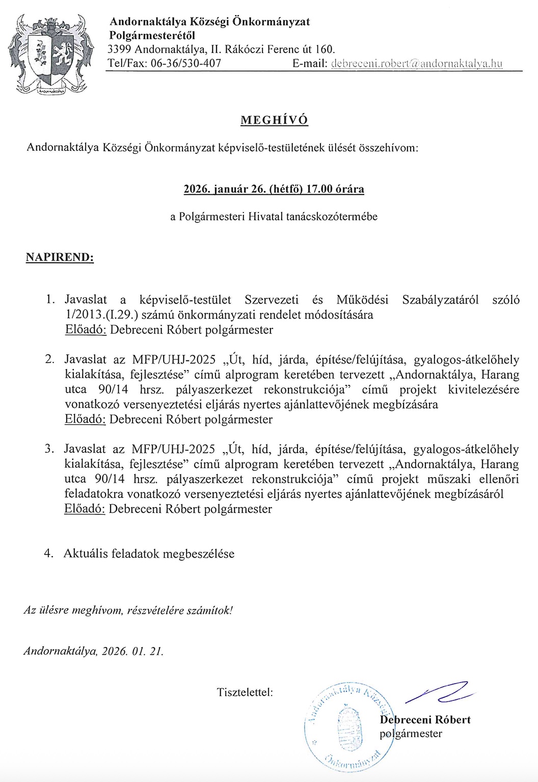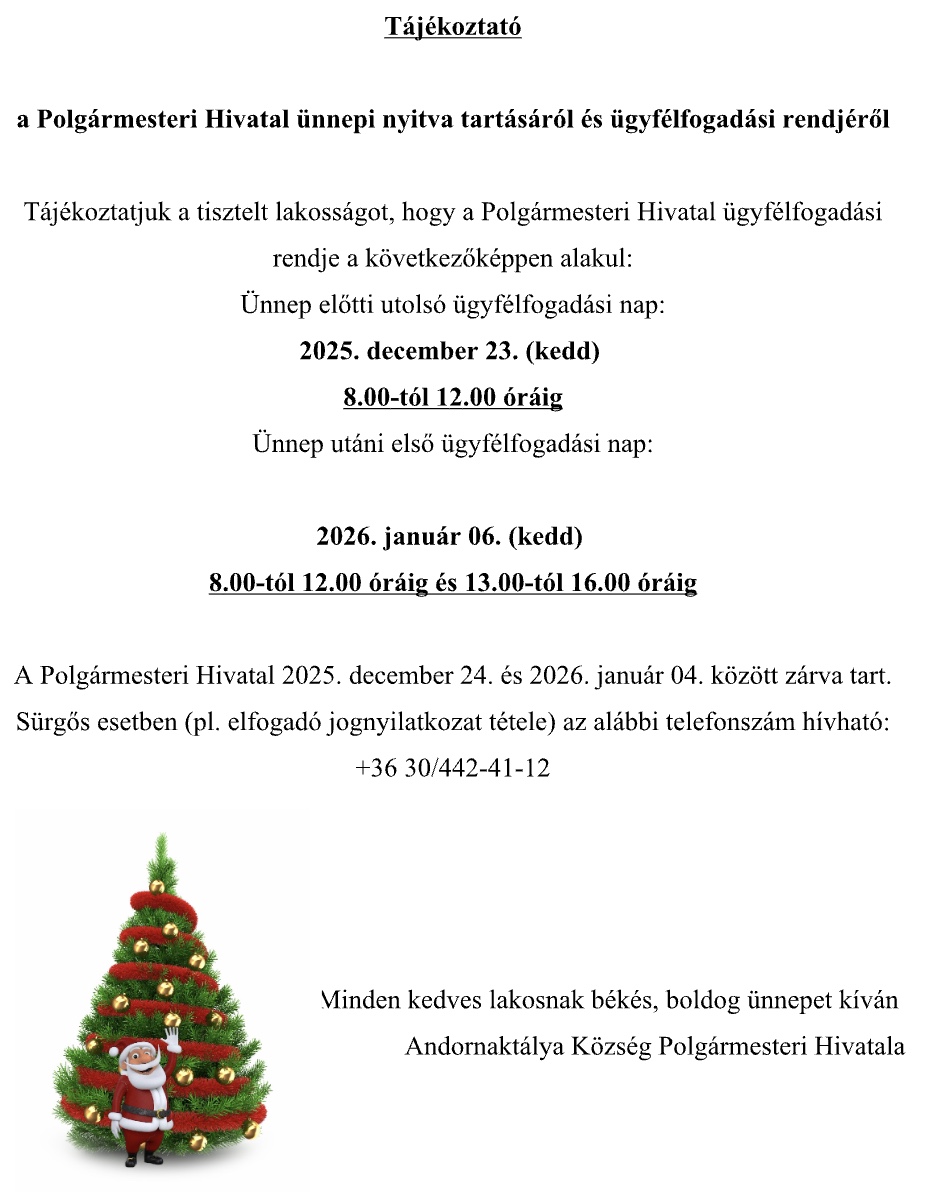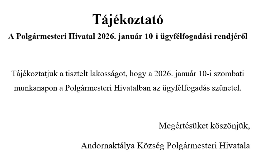 Az adózás rendjéről szóló 2017. évi CL. törvény 130. § (1) bekezdése, valamint Andornaktálya Községi Önkormányzat 2/2024. (II.29.) rendelete alapján az önkormányzati adóhatóság a helyi adó vonatkozásában az ötszázezer forintot elérő, 90 napon keresztül folyamatosan fennálló adótartozással rendelkező jogi személy, egyéb szervezet és vállalkozási tevékenységet folytató természetes személy nevét, elnevezését, székhelyét, telephelyét, adóazonosító számát és az adótartozás összegét közzé teszi. A link itt tekinthető meg...